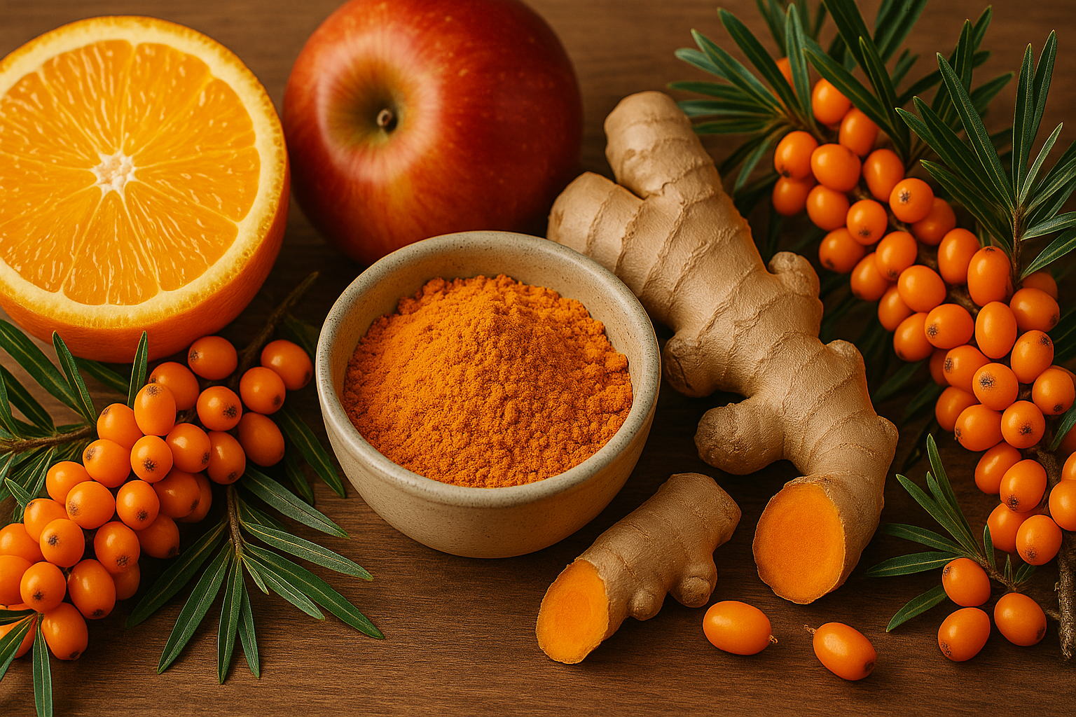 Combinăm cătina cu ingrediente naturale precum ghimbir, portocală, turmeric sau măr, creând rețete funcționale, echilibrate și eficiente.